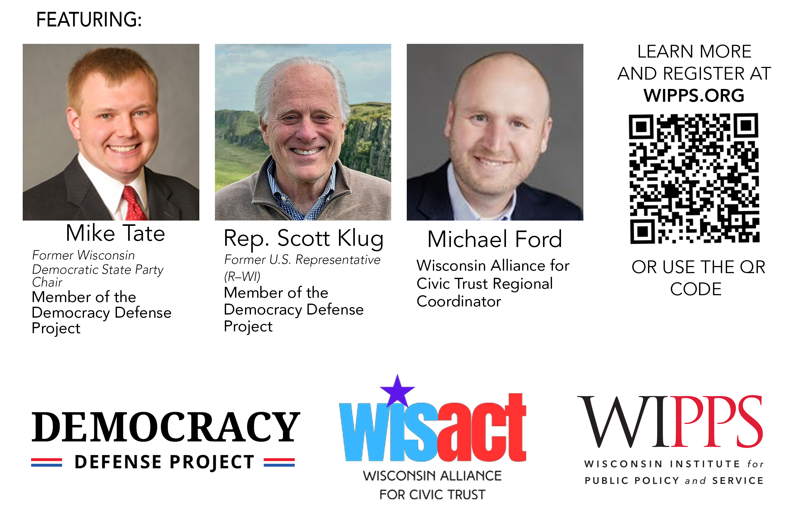 The virtual program will feature Mike Tate, former chair of the Democratic Party of Wisconsin, and Scott Klug, former Republican U.S. representative for Wisconsin’s 2nd Congressional District, both representing the Democracy Defense Project Wisconsin, as well as Michael Ford, regional coordinator for WisAct.